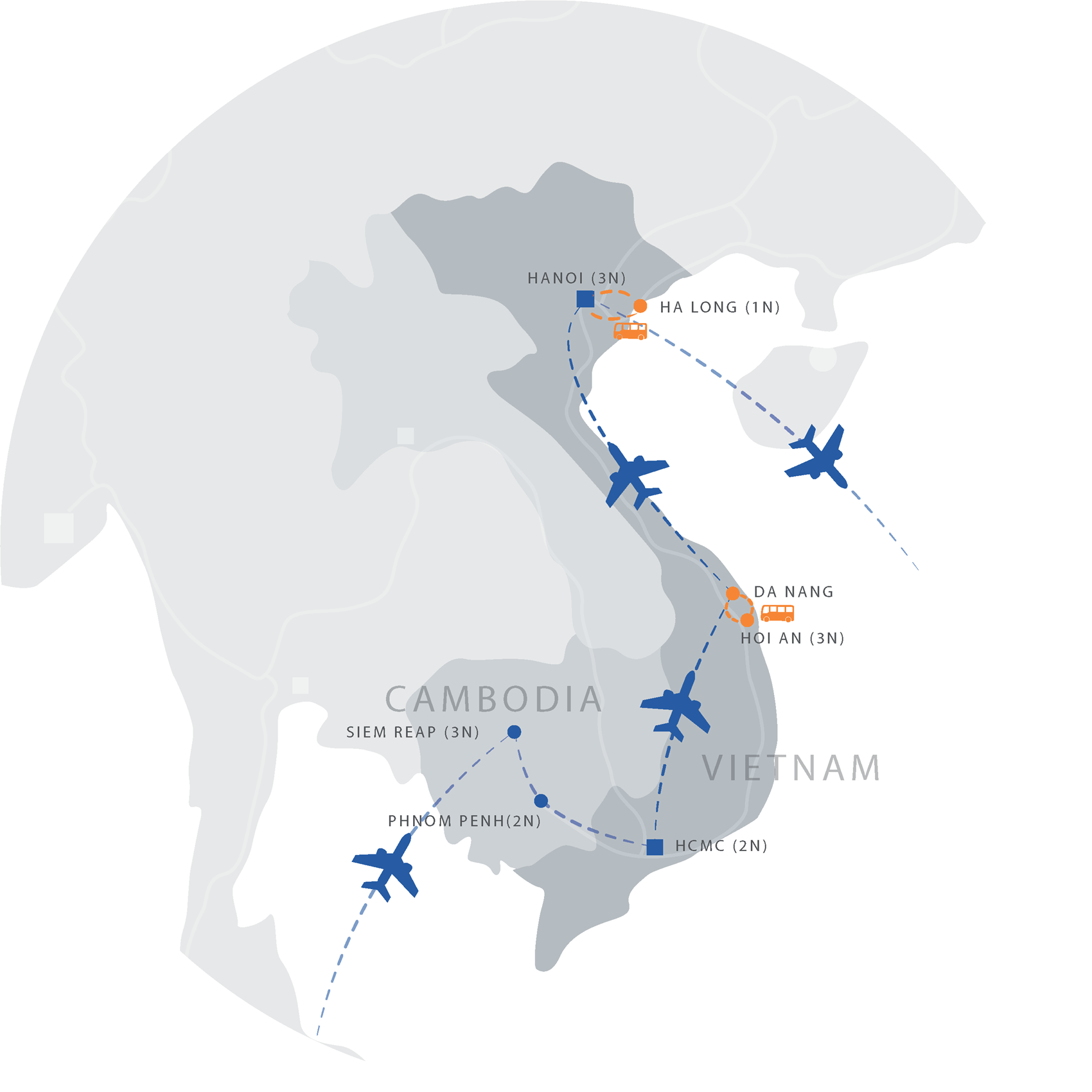 - Land only price: Tour starts from Arrival transfer in HCMC (Saigon) to Departure transfer in Phnom Penh, including domestic Siem Reap - Phnom Penh; Saigon - Da Nang - Hanoi air tickets & taxes but excluding any International air tickets.